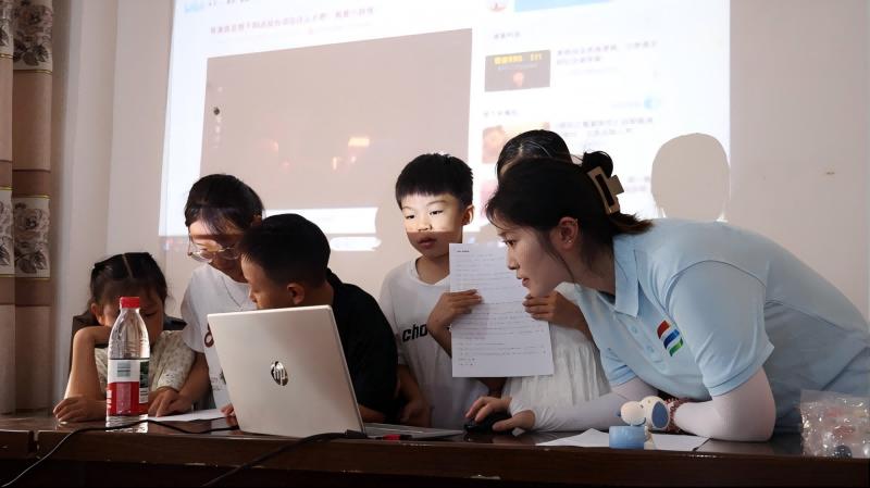 (圖為實(shí)踐團(tuán)成員在普通話課堂上帶孩子們進(jìn)行趣味配音小游戲。譚皓澤供圖)