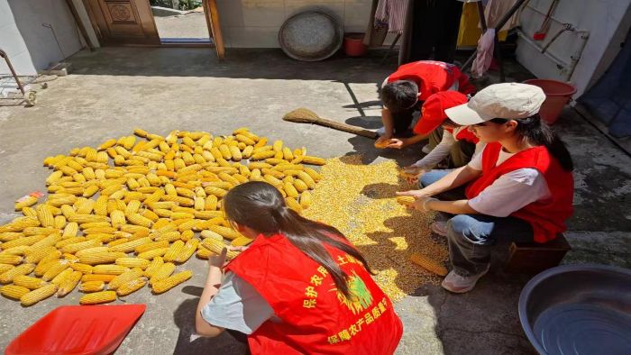 實踐隊隊員們還熱心幫助村民們晾曬玉米和稻谷。隊員們汗水浸濕了衣衫,以實際行動樹立了勞動意識和價值觀,減輕了農(nóng)戶的負(fù)擔(dān),傳遞了愛心與溫暖,展現(xiàn)了鄉(xiāng)村團(tuán)結(jié)互助的精神風(fēng)貌。