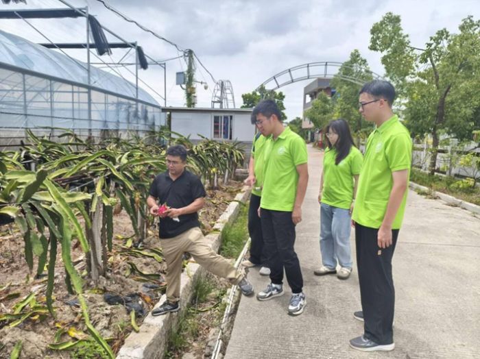 鄭培忠為實踐隊員講解農(nóng)場的火龍果栽培技術 黃鴻文攝