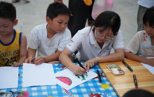 四十多度的高溫擋不住實踐團成員與孩子們共赴一場藝術(shù)之約。我們不僅手把手傳授繪畫的基本技巧,更以優(yōu)秀作品為窗、以藝術(shù)故事為橋,細細播撒對美的感知與熱愛,讓孩子們在熏陶中學(xué)會感受美、欣賞美、進而勇敢創(chuàng)造美。當(dāng)畫筆在紙上流轉(zhuǎn),一個個飽滿的西瓜、一串串鮮靈的水果躍然紙上,汗水浸濕的衣衫旁,是孩子們亮晶晶的眼睛;而那些畫得格外出色的小小創(chuàng)作者,總能收獲一份扭扭氣球擰成的驚喜——這份在熱浪中綻放的藝術(shù)啟蒙,既有技巧的傳遞,更有熱愛的點燃,讓美在歡笑與汗水里扎下了根。