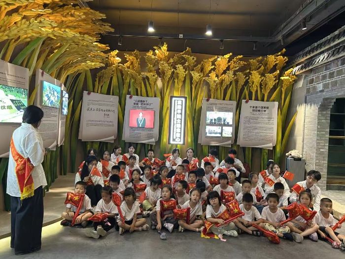 活動(dòng)尾聲,袁隆平工作室一樓展館內(nèi),“榮藥”實(shí)踐隊(duì)師生與小朋友齊聚?粗菏 “禾下乘涼夢(mèng)” 的科研故事展示,聽著 “一生逐稻” 的奉獻(xiàn)歷程,崇敬之情在空間流淌。