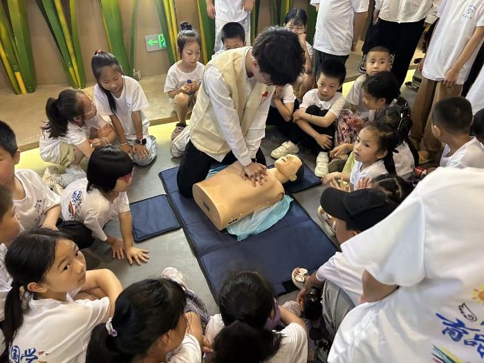 圖為“榮藥”實(shí)踐隊(duì)隊(duì)員陳安正在向小朋友們演示心肺復(fù)蘇教學(xué)。 周嘉琪供圖