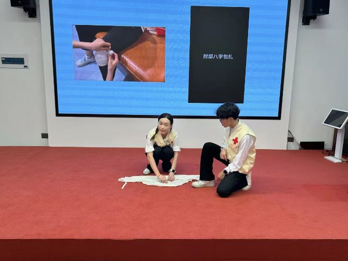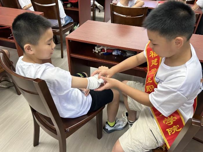 圖為“榮藥”實(shí)踐隊(duì)隊(duì)員正在向小朋友示范關(guān)節(jié)包扎、繃帶螺旋包扎等實(shí)用技巧。 周嘉琪供圖