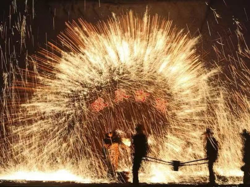 打樹花,感受勇敢者的藝術(shù)。除了剪紙,蔚縣還有一項傳承五百余年的古老絕技——打樹花。該項技藝不僅是河北“省級非物質(zhì)文化遺產(chǎn)”,2021年更入選國家級非物質(zhì)文化遺產(chǎn)代表性項目名錄擴(kuò)展項目名錄。其起源可追溯至明代,當(dāng)時貧苦的鐵匠們因無力購買煙花,便以廢鐵熔化成水,潑灑城墻迸發(fā)火花,這一充滿智慧的創(chuàng)造逐漸演變?yōu)樵砀5拿袼资⑹拢蛔u(yù)為“勇敢者的藝術(shù)”。表演現(xiàn)場,鐵匠將1600℃高溫的鐵水潑灑至古城墻,鐵水遇冷炸裂,迸濺出萬朵金紅色火花,形成“火樹金花不夜天”的奇景。