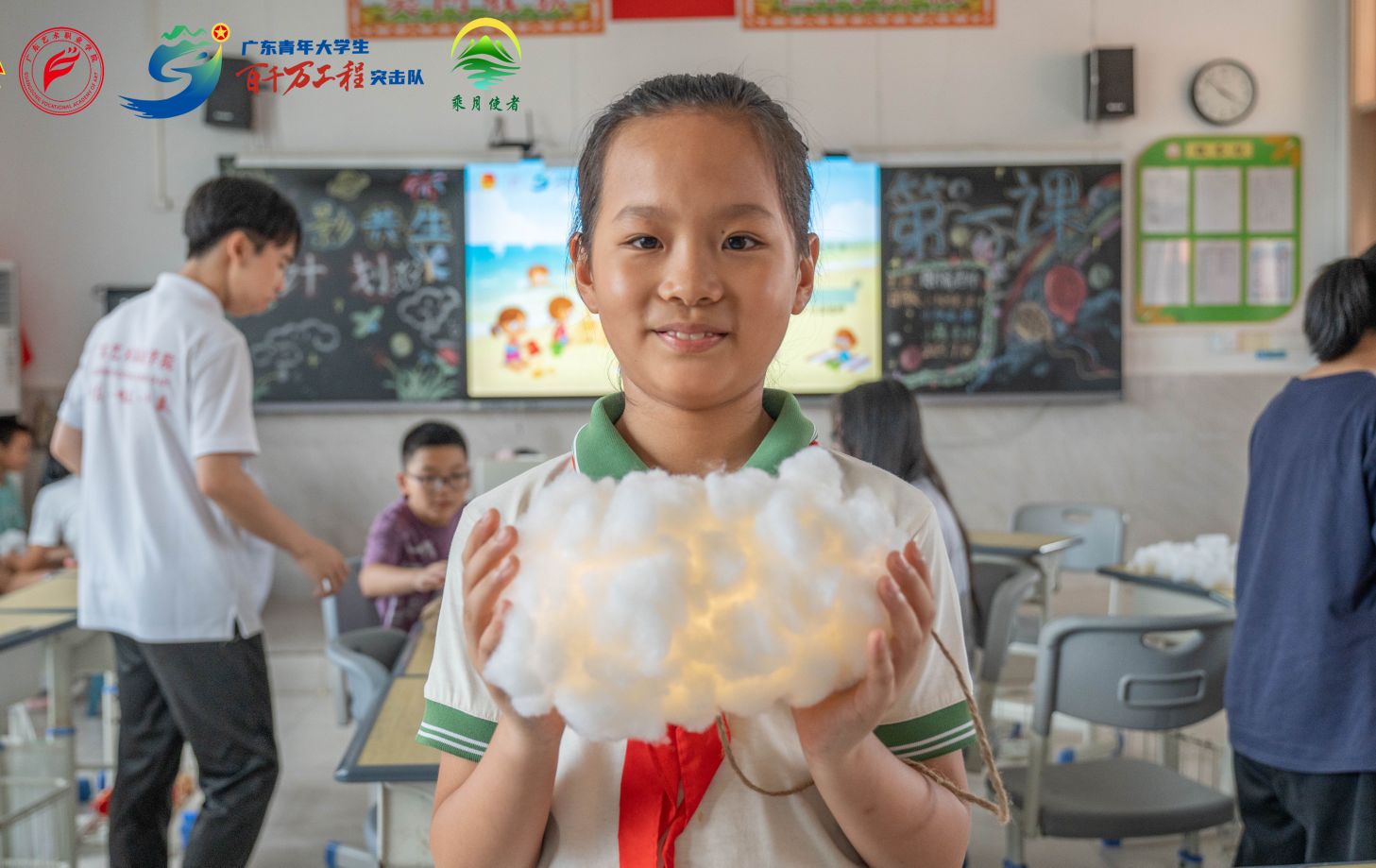 在動(dòng)手創(chuàng)作環(huán)節(jié),孩子們在隊(duì)員的指導(dǎo)下,制作了可愛的“云朵燈”和煙花蝴蝶小夜燈。他們的小手忙碌著,捏捏棉花,繞繞燈串,教室里充滿了專注而輕松的氣氛。看著自己手中漸漸成型的燈光作品,孩子們的臉上露出了驚喜又滿足的笑容。這些小小的燈光裝置,不僅是孩子們創(chuàng)意的結(jié)晶,更是他們走進(jìn)光影創(chuàng)作世界的第一步。
