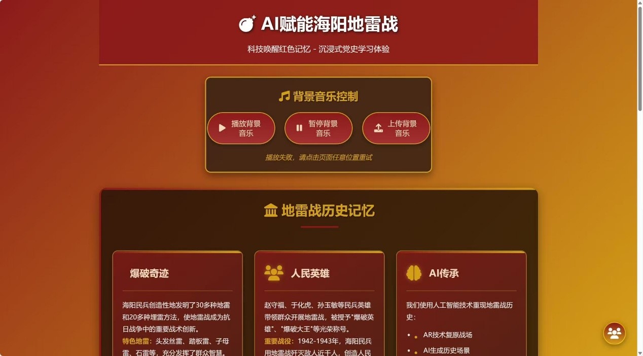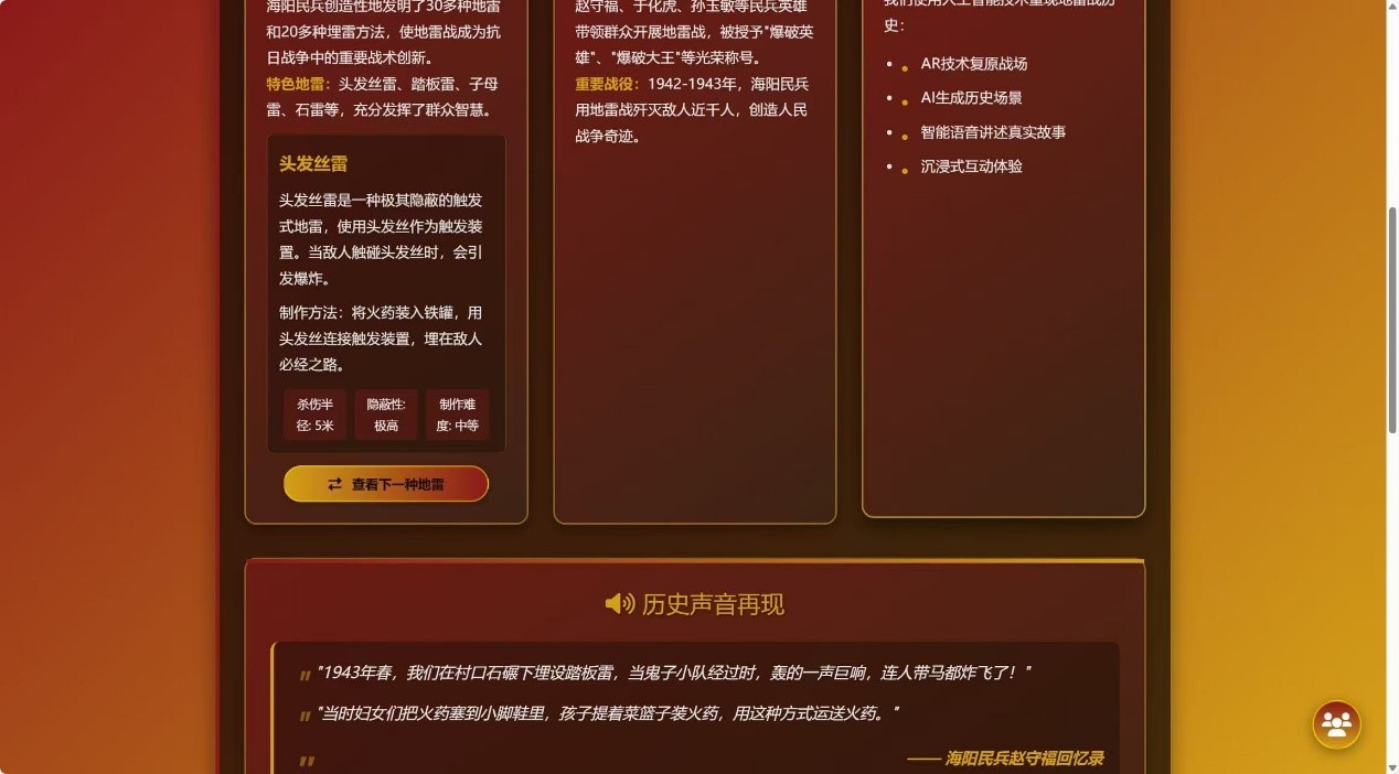 從紀(jì)念館返程,實(shí)踐團(tuán)便錨定“AI賦能紅色傳承”方向全力攻堅(jiān)。歷經(jīng)日夜打磨,8月上旬,“AI賦能海陽(yáng)地雷戰(zhàn)”主題網(wǎng)頁(yè)正式上線。進(jìn)入網(wǎng)頁(yè),背景音樂(lè)模塊靈動(dòng)可控,播放、暫停、自定義上傳,用旋律為歷史敘事鋪陳沉浸底色;“地雷戰(zhàn)歷史記憶”板塊,“爆破奇跡”細(xì)數(shù)30余種地雷、20多類(lèi)埋雷技法的創(chuàng)新火花,“人民英雄”深情鐫刻趙守福等先烈事跡,讓沉睡史料“活”成可感可知的立體故事 。
