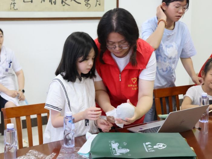 7月11日,團(tuán)隊(duì)與揚(yáng)州市中醫(yī)院合作舉辦"小郎中研學(xué)營"活動(dòng)。15名熱愛中醫(yī)的中小學(xué)生化身“小郎中”,走進(jìn)市中醫(yī)院參加了一場(chǎng)“本草游園會(huì)”,沉浸式感受傳統(tǒng)中醫(yī)藥文化的魅力。在這群“小郎中”中,還有兩位分別來自美國和新西蘭的小朋友Sasha和Darren。
