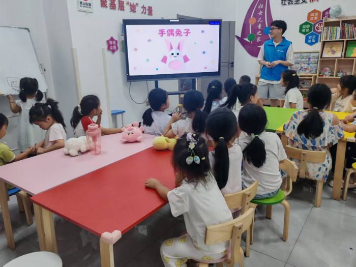 活動開場,志愿者借助大屏幕展示“手偶兔子”主題課件,屏幕上,一只軟萌的粉色紙兔子端坐著。志愿者站在屏幕旁,用生動有趣的語言引導(dǎo)孩子們觀察:“小朋友們,快看看這只漂亮的兔子,想不想也有一只?”瞬間引發(fā)孩子們的興趣,大家踴躍舉手,想要向志愿者學習制作紙兔子。