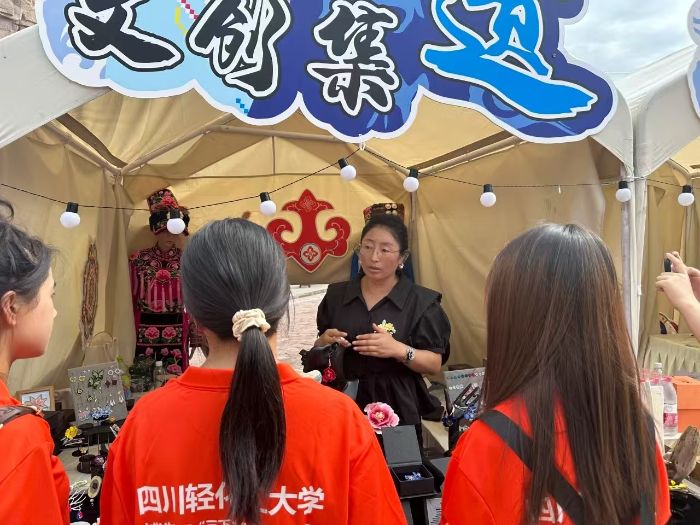 實踐首站,團(tuán)隊來到中國古羌城,沉浸式感受羌族文化的獨特魅力。在文創(chuàng)店鋪內(nèi),刺繡精美的傳統(tǒng)服飾、紋樣別致的民族飾品讓人目不暇接,店主通過一件件手工藝品,講述著羌族先民對自然的敬畏與對生活的熱愛。“我們鼓勵學(xué)生將現(xiàn)代設(shè)計理念融入傳統(tǒng)羌繡,讓老技藝跟上新潮流。”阿壩職業(yè)學(xué)院的陳老師介紹,師生共同設(shè)計的羌繡筆記本、金屬書簽等文創(chuàng)產(chǎn)品已進(jìn)入市場調(diào)研階段,部分還申請了專利。