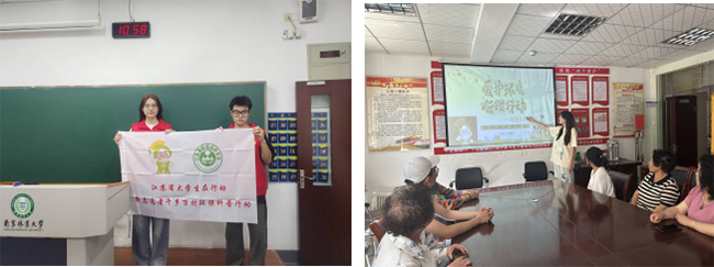 為積極響應中國環(huán)境科學學會與江蘇省環(huán)境科學學會關于“江蘇省大學生在行動”的號召,傳承環(huán)保實踐精神,南京林業(yè)大學生態(tài)與環(huán)境學院“綠意先鋒小分隊”于2025年暑期再度啟程,聚焦“雙碳”目標、新污染物治理與生物多樣性保護三大議題,深入社區(qū)及周邊學校,開展了一系列形式多樣、內(nèi)容豐富的科普宣傳與社會實踐。