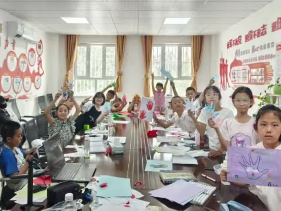 ▲圖為田園社區(qū)的小孩子們展示手印貼畫