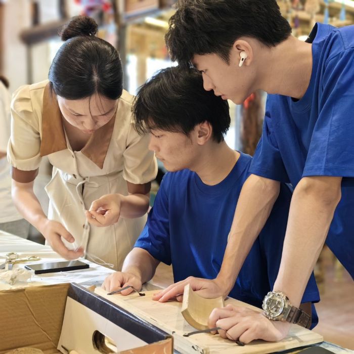 當實踐觸及"傳承如何可持續(xù)"的深層思考時,非遺傳承人的經驗為團隊提供了答案。拜訪國家級竹簧傳承人何華一先生,其"非遺要活在當下"的理念與實踐極具啟示:他將竹簧從傳統擺件拓展至現代壁畫、家居裝飾,用設計創(chuàng)新讓古老技藝融入生活;其女探索的"非遺 + 文創(chuàng)"、"非遺 + 研學"路徑,則展現了傳統與市場結合的可能。何家父女的實踐印證了傳承需以創(chuàng)新為橋,讓文化在時代語境中找到新坐標,為團隊的傳承思考打開了新視野。