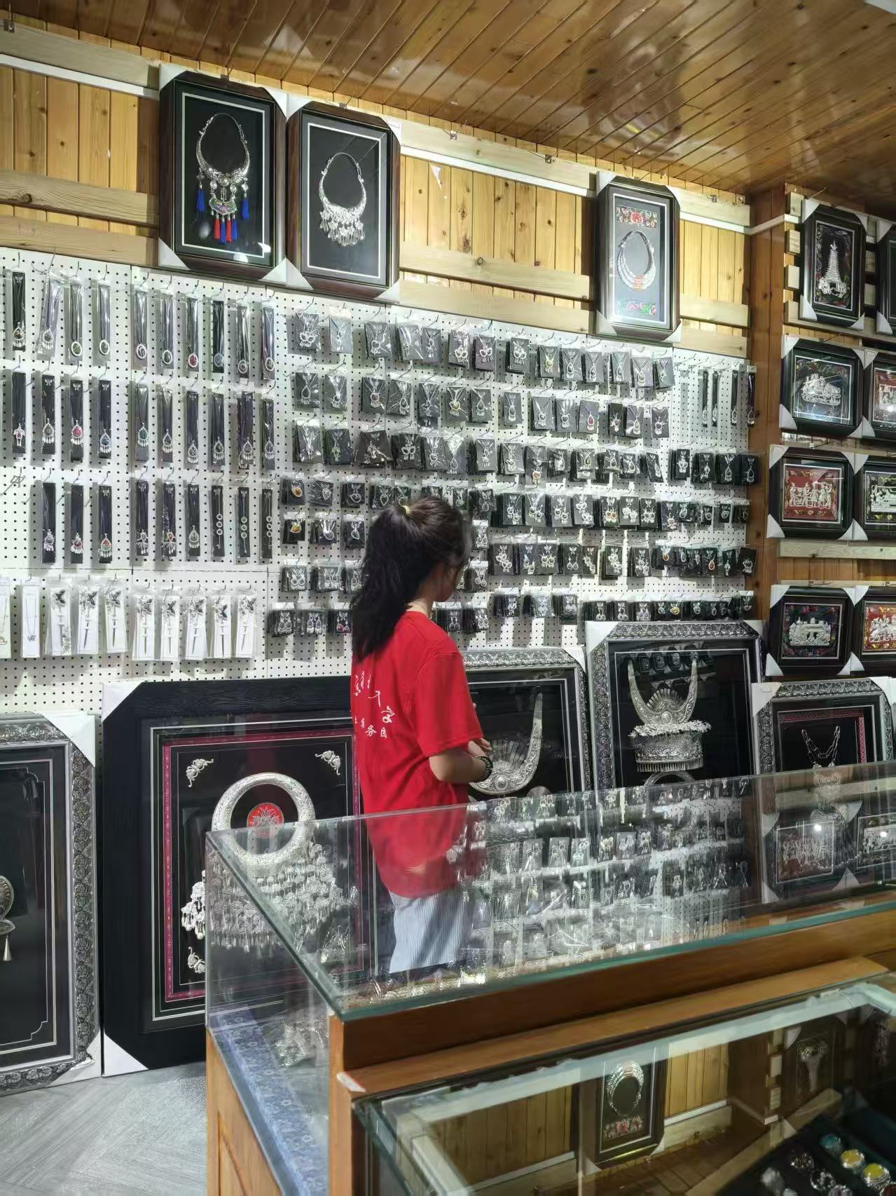剛踏入苗寨商品店,銀飾的光澤、刺繡的艷麗,瞬間把大家包圍。那些銀飾,在燈光下閃著清冷又溫潤的光,匠人們手工鏨刻的紋路,像把苗家的山水、神話都揉了進(jìn)去;刺繡更是,五彩絲線在布上 “跳舞”,花鳥魚蟲、古老圖騰,一針一線都在講苗寨的故事。