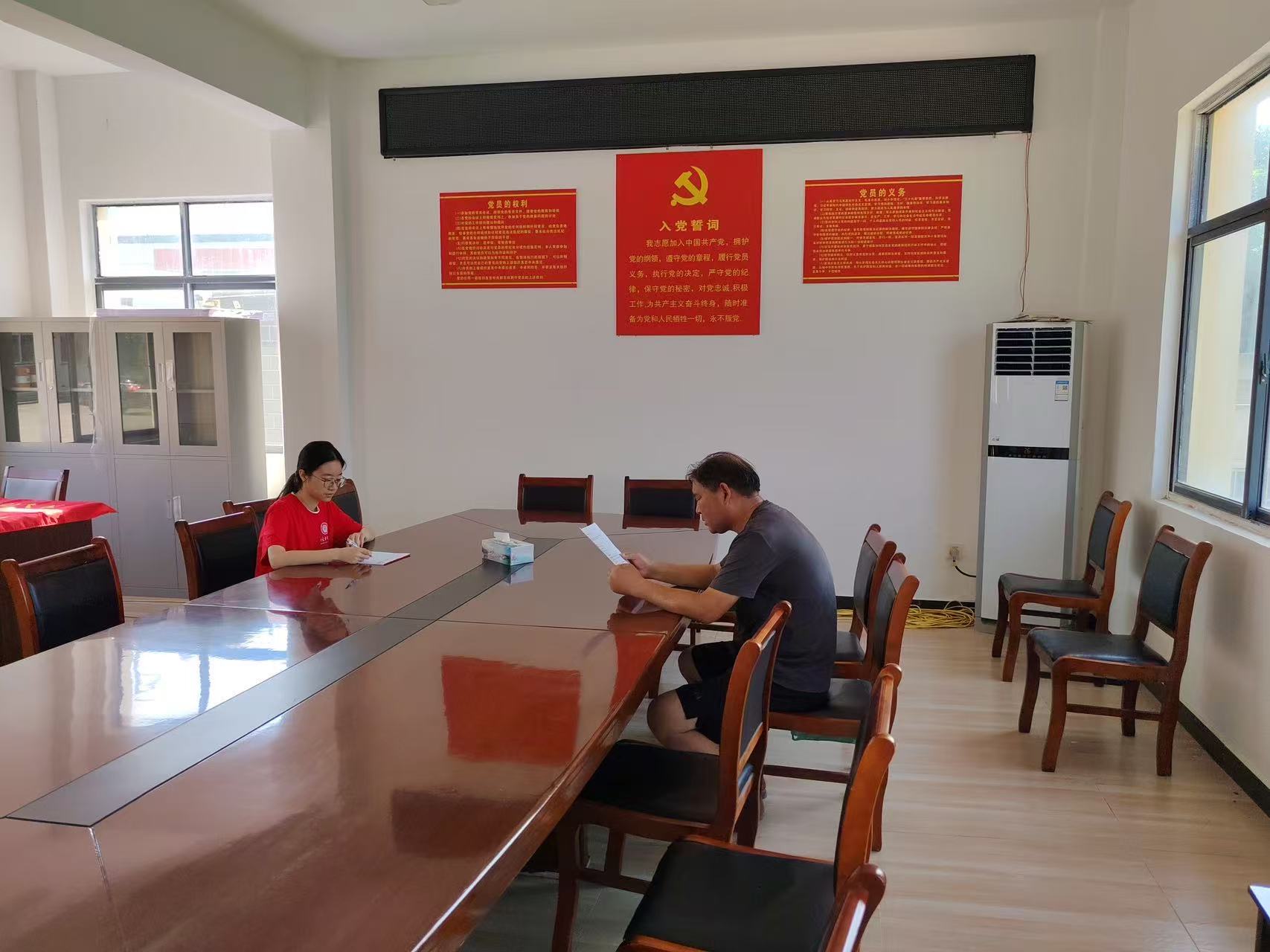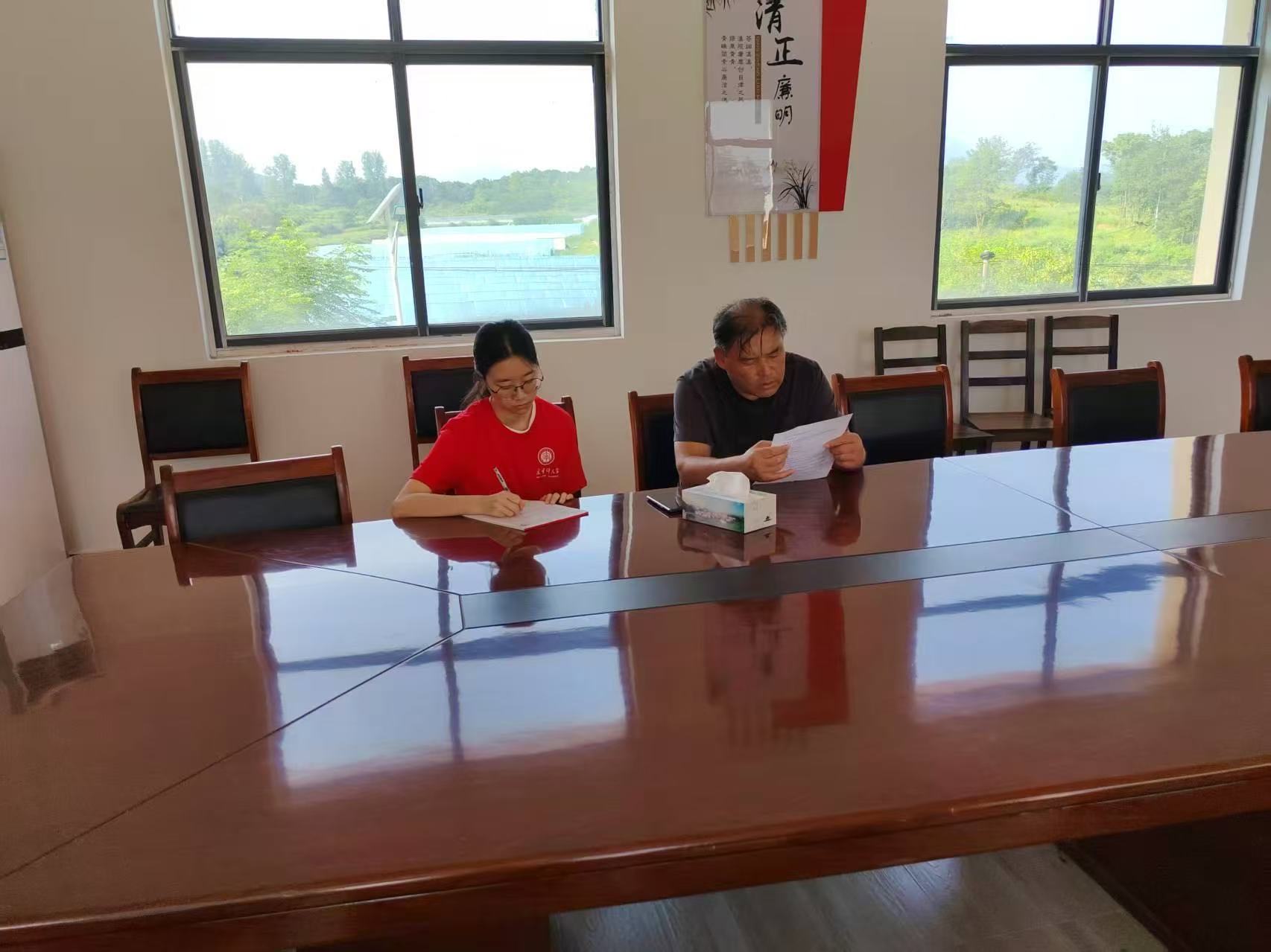 黃陂木蘭花鄉(xiāng)的晨光里,農(nóng)機(jī)駛過稻田的聲響打破了村落的寧靜。村部會議室里,實踐團(tuán)成員和村主任圍坐在長桌旁。墻上“入黨誓詞”紅得亮眼,窗外能瞅見大棚的影子。村主任翻開資料,把小寨村“家底”全倒了出來。講產(chǎn)業(yè)時,主任眼里冒光。