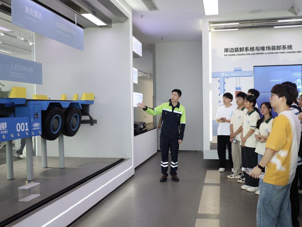 圖為講解員為同學們介紹碼頭的自動化設備及運行原理(通訊員楊婷媛攝)