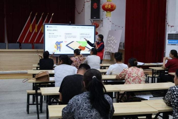 此圖為實(shí)踐團(tuán)隊(duì)員向居民就宣傳冊(cè)上的新型詐騙手段進(jìn)行講解。曹渭荻供圖