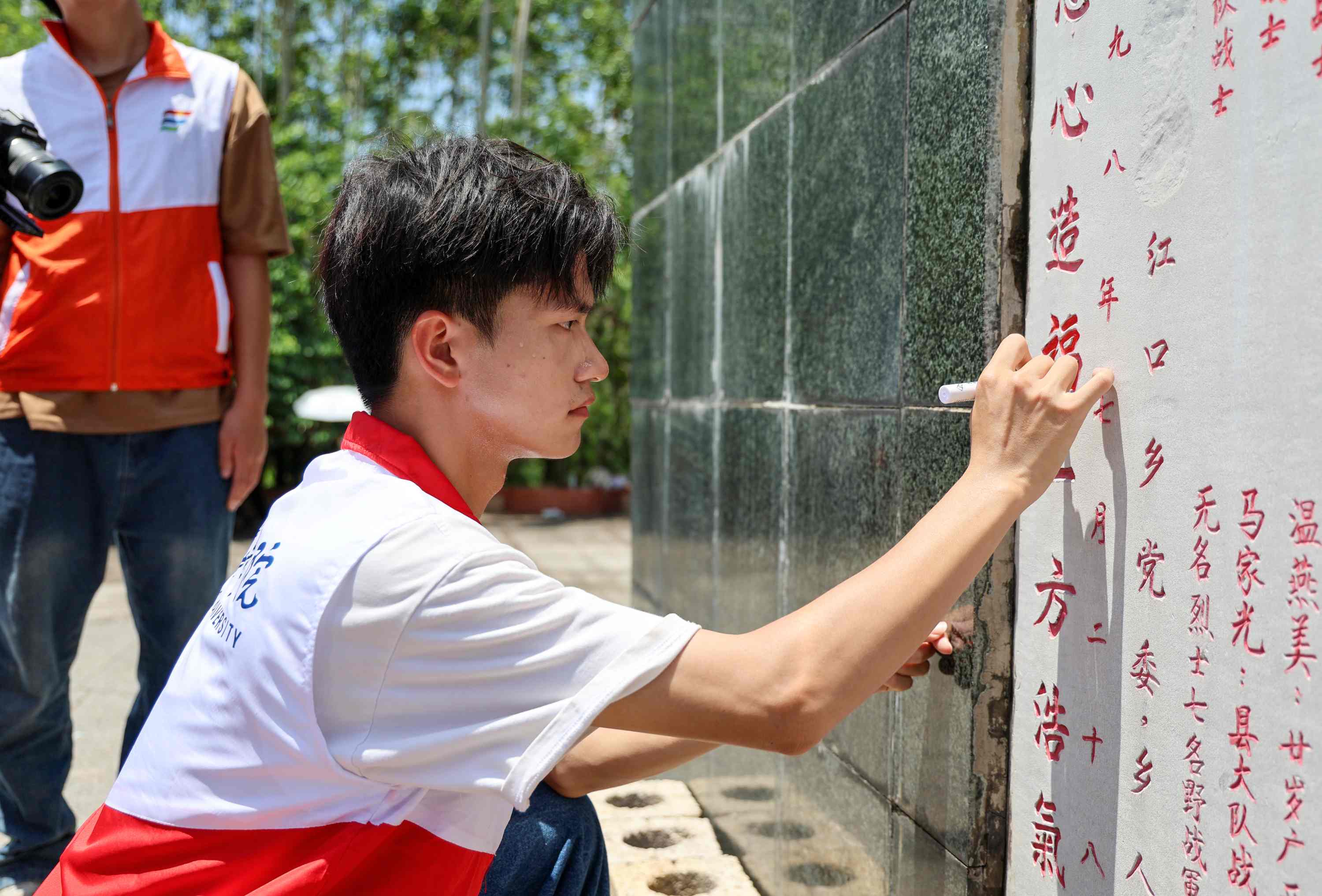 圖為實踐團(tuán)成員為永垂不朽碑描紅